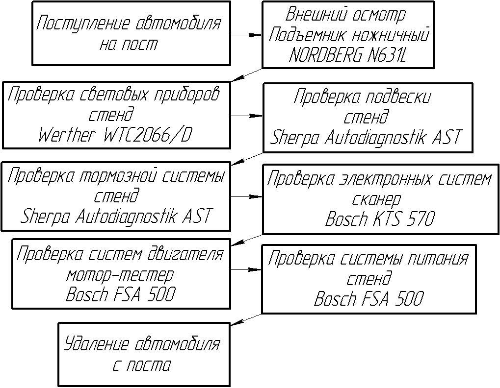 На рис. 5.1 представлена схема укрупненного технологического процесса диагностирования автомобилей, позволяющая представить возможные пути их движения при проведении плановой диагностики с момента поступления автомобиля в ОАС до момента выпуска его на линию.