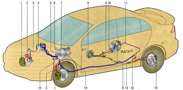 1 - тормозной механизм переднего колеса; 2 - шланги тормозных механизмов передних колес; 3 - трубопровод тормозного механизма правого переднего колеса; 4 - гидроэлектронный блок ABS; 5 - главный тормозной цилиндр; 6 - бачок главного тормозного цилиндра; 7 - вакуумный усилитель; 8 - рычаг привода стояночного тормоза; 9 - тросы (передний и задние) привода стояночного тормоза; 10 - шланги тормозных механизмов задних колес; 11 - трубопровод тормозного механизма правого заднего колеса; 12 - тормозной механизм заднего колеса; 13 - трубопровод тормозного механизма левого заднего колеса; 14 - педаль тормоза; 15 - трубопровод тормозного механизма левого переднего колеса.
