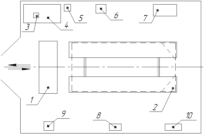 1 – Тормозной стенд; 2 – подъемник ножничный; 3 – мультимарочный сканер; 4 – верстак слесарный; 5 – газоанализатор; 6 – мотор-тестер; 7 – тележка инструментальная; 8 – пневмогайковерт; 9 - стенд проверки световых приборов; 10 – люфтомер.