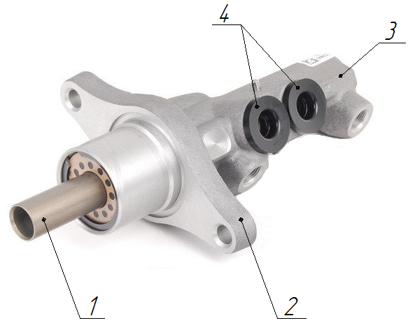 1 - толкатель поршня; 2 - фланец крепления цилиндра; 3 - корпус тормозного цилиндра; 4 –резиновые насадки