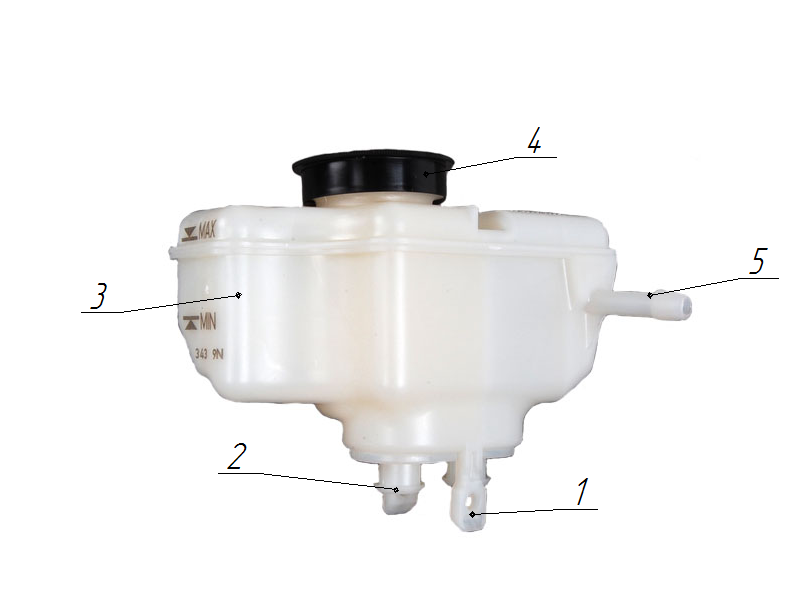 1 - скоба крепления бачка; 2 - патрубок бачка; 3 – бачок; 4 – пробка бачка; 5 - штуцер подключения питающего шланга гидропривода выключения сцепления