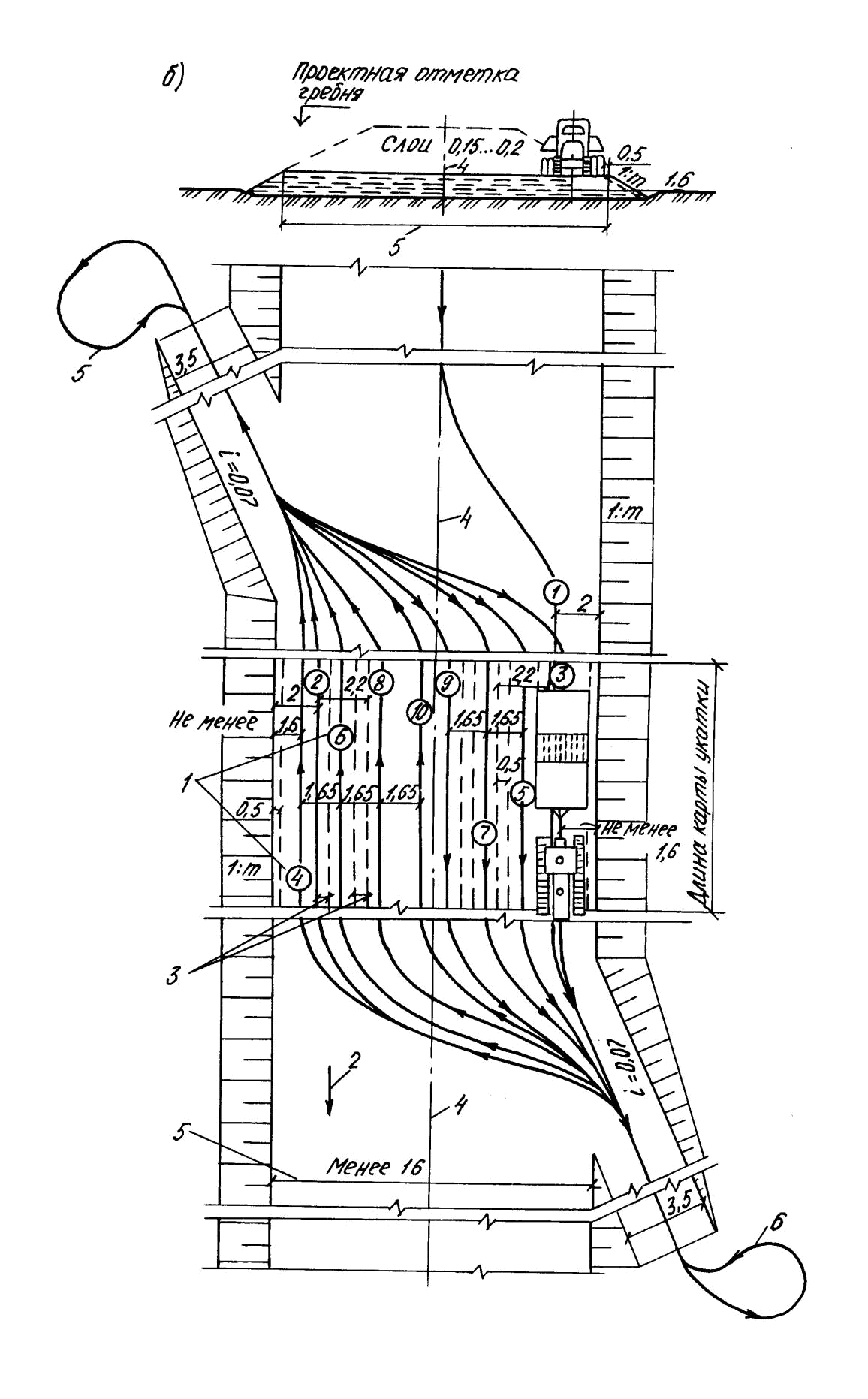 6 – развороты катка; 1: m – крутизна откосов насыпи