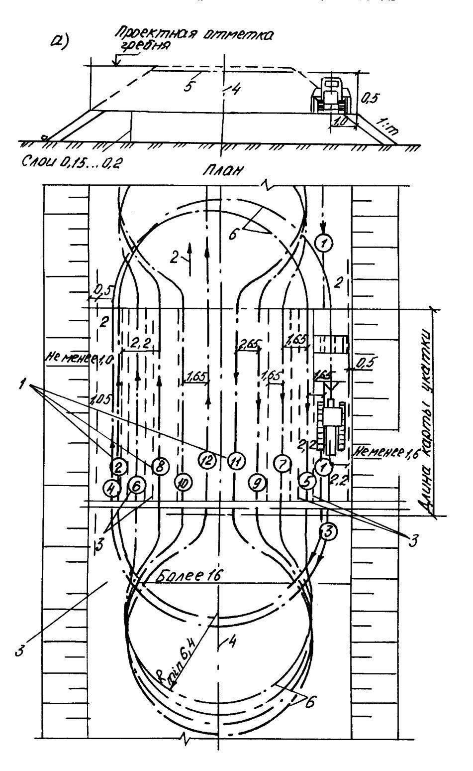 Рис. 3.2. Схема уплотнения участка прицепным катком со съездом с насыпи (обозначения те же, что на рис 3.1)
