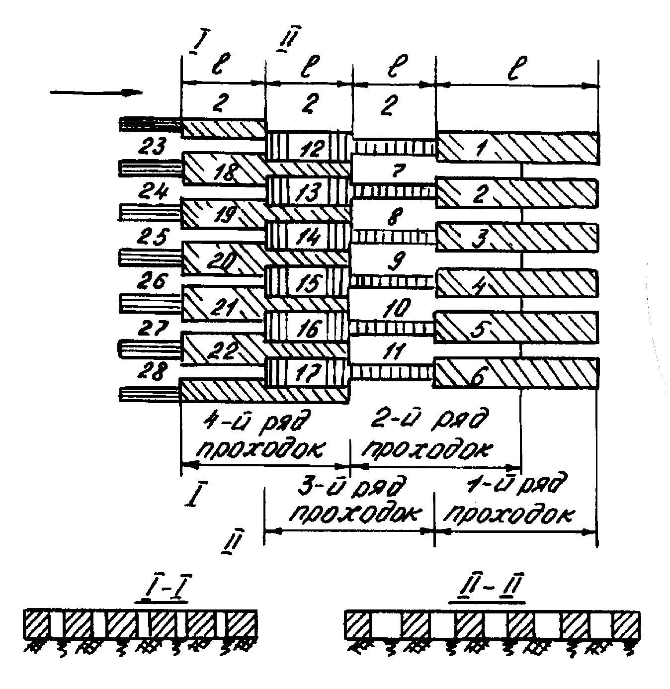 Рис. 2.16. Ребристо-шахматная схема резания грунта скреперами