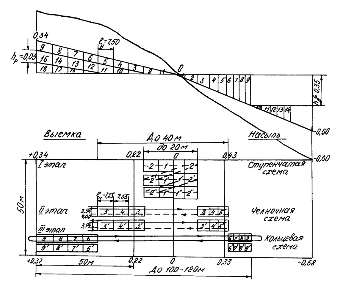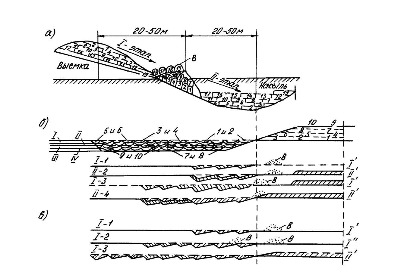 1–19 – порядок зарезания и укладки грунта в насыпь; I–IV – порядок разработки слоев грунта; I–1 – 1-й слой, первое зарезание; I–2 – 1-й слой, второе зарезание; I–3 – 1-й слой, третье зарезание; II–2 – 2-й слой, второе зарезание; II–4 – 1-й слой, четвертое зарезание;