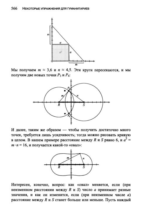 -Представим, что сначала отрезок m очень мал, следовательно мал и круг с радиусом /и, он является почти точкой. Тогда другой отрезок л, наоборот, очень велик, и круг с радиусом η тоже велик настолько, что уже не умещается на бумаге, он лежит «где-то в бесконечности». Значит, эти два круга не пересекаются, и следовательно, точки кривой не существует.