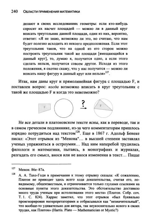 А сейчас рассмотрим один текст из «Менона», чтобы увидеть особенную роль, которую играли предположения16 как в математи ке, так и в философии. В отличие от разговора Сократа с молодым слугой, который мы обсуждали в параграфе 3.7, пример, который мы рассматриваем здесь, дан в сокращенной форме: