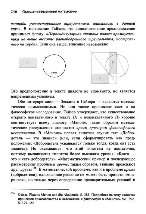 Для Зескина ключевой пункт состоит в том, что математики во времена Платона не смогли решить задачу вписания данной пло щади в круг в форме треугольника, так как она требует решения уравнений четвертой степени. Они только могли сказать: «если...», т. е. сформулировать гипотезу. В этом случае «гипотеза» (или «предположение») является не фундаментом, на котором можно строить убедительное рассуждение и делать выводы, но только «пока нерешенной возможностью». При такой интерпретации геометрический пример используется Платоном не как образец рационального мышления, а как предупреждение «не ожидать от беседы больше, чем она на самом деле может дать» . Зескин пишет: «Метод гипотез в "Меноне" приводит, в связи с учением о добродетели, к апории. Чувство недоумения усиливается ссылкой на геометрическую задачу, решение которой выходило за рамки возможностей математиков, современных Платону. Если спросить, почему Платон вводит метод, в котором не был уверен, мы ответим, что, приводя нас к апории, он хочет, чтобы мы проследили свои шаги и увидели, где же произошла решающая ошибка. В нашем случае роковая ошибка происходит тогда, когда Сократ "поддается" Менону и соглашается вначале обсудить вопрос, который является производным. Смысл этого ясен: полагание производного вопроса первым приводит к возникновению неприятностей — так же, как это привело к проблемам и для геометров»138.