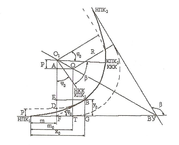 Для разбивки переходных кривых известны различные способы. Рассмотрим наиболее распространенный на практике случай разбивки переходной кривой способом сдвижки центра О. Разбивку переходной кривой производят в предположении, что на местности известно положение тангенса первоначальной круговой кривой (точки Т). Необходимо знать сдвижку р круговой кривой и расстояние m0 от начала переходной кривой (точки НПК) до точки тангенса Т0. Для этого находят m – расстояние от начала переходной кривой до нового положения Т, затем определяют сдвижку р, угол φ0 и все координаты кривой.