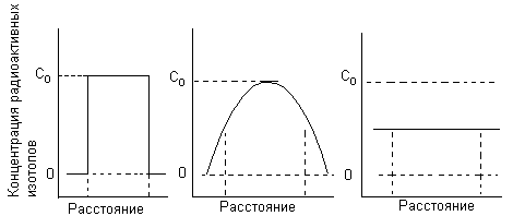 Стандартным методом определения коэффициента диффузии в чистых металлах является нанесение слоя радиоактивного изотопа на образец данного металла с последующим отжигом и определением глубины проникновения радиоактивного вещества. Исходное распределение атомов с течением времени сглаживается и в конце концов становится одинаковым по всему объему (Рис.), т.е. из-за наличия градиента концентрации возникает макроскопический поток вещества.