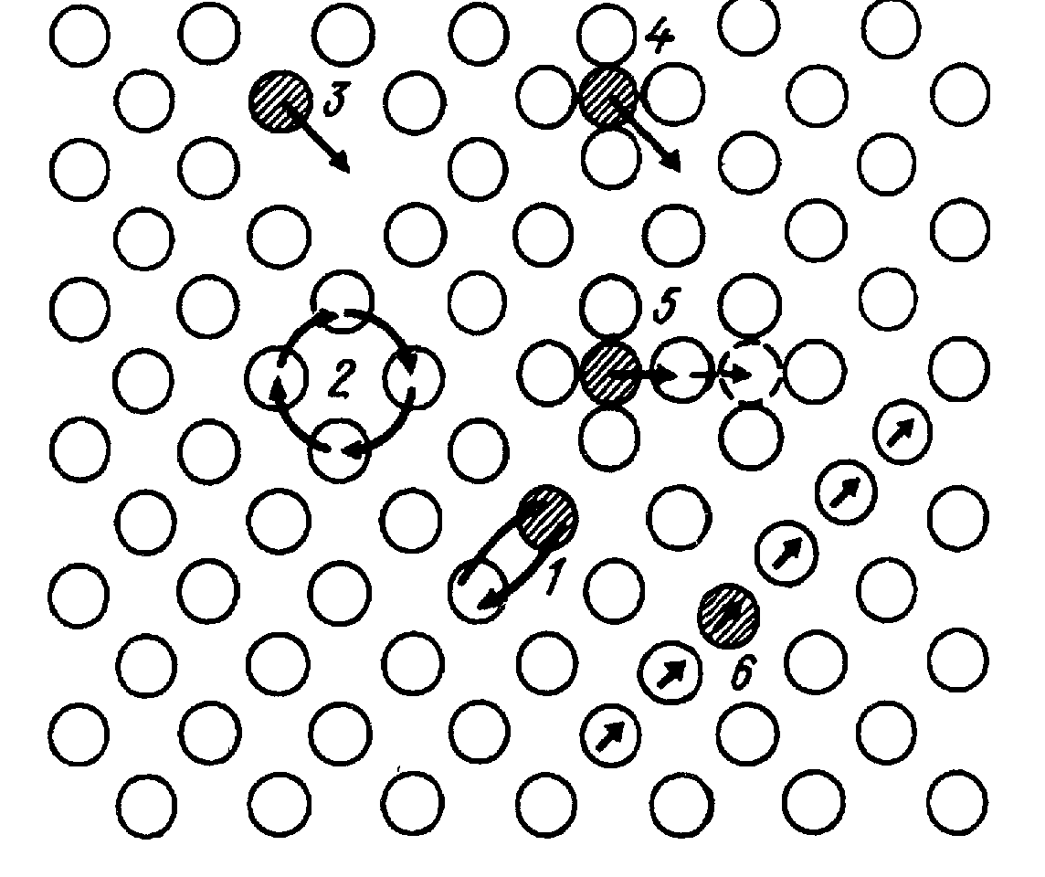 Перемещение при краудионном механизме диффузии подобно распространению волны: каждый атом смещается на малую величину, а возмущение распространяется быстро. Циклический обменный механизм (2) представляется более вероятным по сравнению с простым обменным (1).