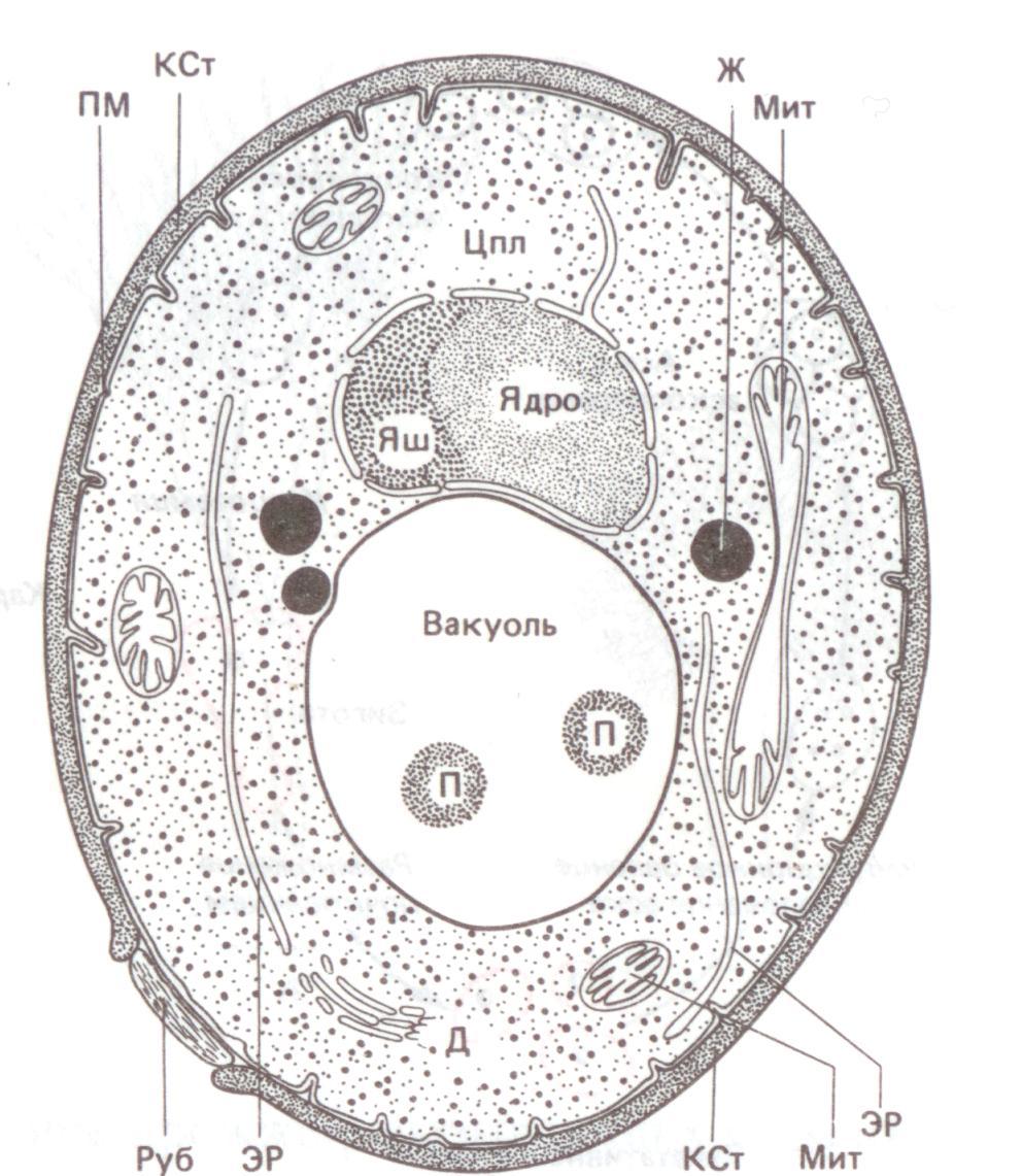 КСт – клеточная стенка; ПМ – плазматическая мембрана; Цпл – цитоплазма, содержащая рибосомы; Яш – ядрышко; Мит – митохондрия; ЭР – эндоплазматический ретикулум; Д – диктиосома; П – гранулы полифосфатов; Ж – жировая капелька; Руб – рубец (шрам почкования)