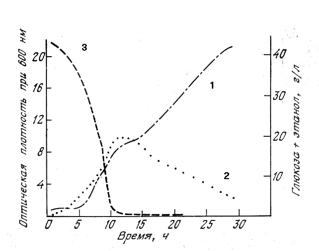 1 – дрожжи; 2 – этанол; 3 – глюкоза