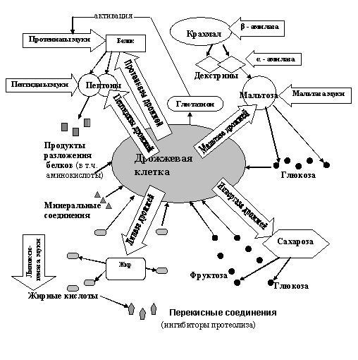 На рис. 4.1 схематически показаны биохимические процессы, происходящие в тесте под действием ферментов муки и дрожжей.