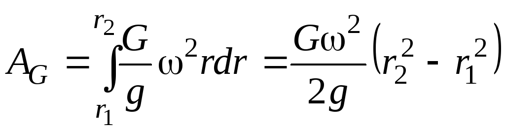 где А – удельная энергия, приобретаемая жидкостью под действием центробежной силы при ее перемещении из точки 1 в точку 2. Центробежная сила равна С = m∙2∙r = G∙2∙r/g, где m – масса частицы, а G – ее вес; – угловая скорость вращения колеса; r – радиус вращения частицы. Работа силы С, совершаемая при перемещении G кг жидкости из точки 1 в точку 2, составляет