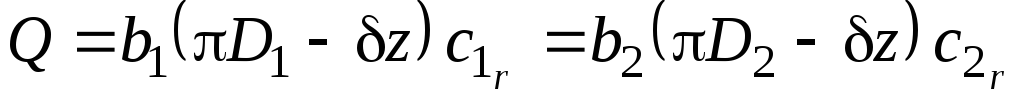 Установим производительность центробежногоо насоса. Очевидно, что она равна расходу жидкости через каналы шириной b1 и b2 между лопатками рабочего колеса (см. рис. 4.4). Поэтому по закону сплошности получаем: