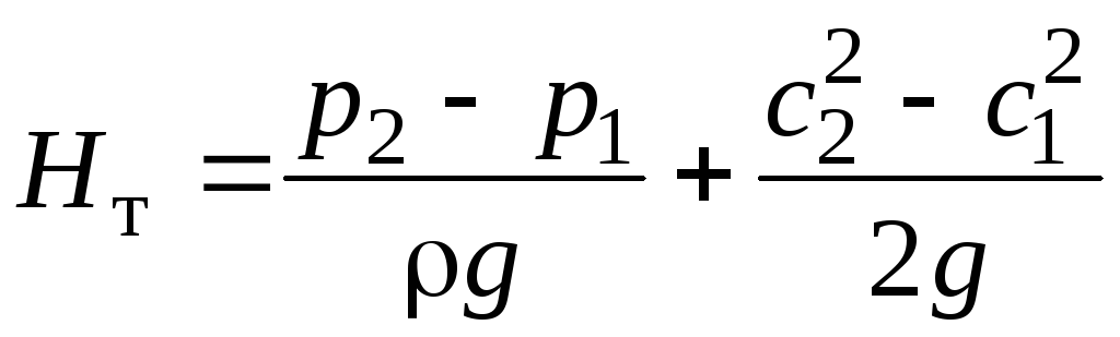 Известно, что напор насоса теоретически равен разности напоров на выходе из колеса Н2 и на входе в него Н1: Нт = Н2 – Н1. В соответствии с уравнением Бернулли напоры Н1 и Н2 составляют: Н1 = р1/ρg + с12/2g; Н2 = р2/ρg + с22/2g. Тогда напор насоса будет