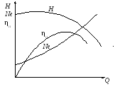 Характеристиками центробежных насосов называются графические зависимости напора Н, мощности на валу Ne и КПД насоса ηн от его производительности Q при постоянной частоте вращения колеса n. Эти зависимости получают при испытаниях центробежных насосов, изменяя степень открытия задвижки на нагнетательном трубопроводе. На рис. 4.5 приведен общий вид характеристик; он может быть объяснен на основе анализа основного уравнения центробежного насоса (4.13) и зависимости (4.14).