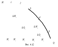 Сущность этого построения заключается в сложении напоров насосов для ряда значений производительности. Для этого проводят ряд линий, параллельных оси Н, и от точек их пересечения с характеристикой насоса откладывают вверх отрезки длиной Н1, Н2, …, Н5. Соединив полученные точки 1, 2,…, 5 плавной линией, получают искомую характеристику. Анализ показывает, что для пологой характеристики последовательное соединение малоэффективно, так как приращение напора ΔHп и производительности ΔQп незначительны (см. рис. 4.12). Для крутой характеристики получается большое повышение напора и малое увеличение производительности ΔQк.. Следовательно, последовательное соединение насосов дает значительное повышение напора при работе на сети с крутой характеристикой.