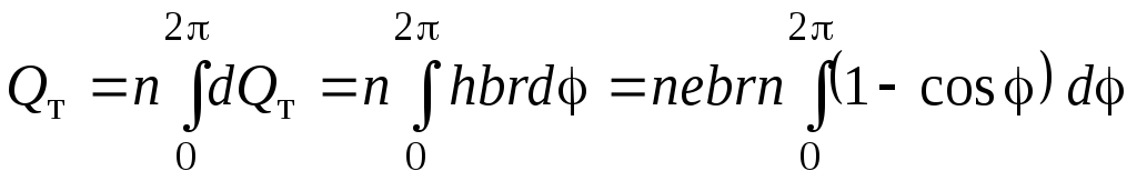 Определим производительность шиберного насоса, полагая, что ротор имеет бесконечно большое число пластин. Для этого соединим точки с, О2 и О1 прямыми линиями. Полученный треугольник изобразим отдельно на рис. 4.25. Рабочая часть пластины (перекрывающая серповидное пространство) равна h = x – (r – e), где e – эксцентриситет. Из треугольника сО2О1 получается x = r∙cos β + + e∙cos(180˚ – φ) = r∙cos β – e∙cos φ. Для большинства насосов e/r → 0, поэтому cos β → 1. Тогда x = r – e∙cos φ и h = e (1 – cos φ). Элементарная теоретическая производительность за один оборот ротора равна dQт = h∙b∙r∙dφ, где b – длина ротора. Полная производительность составляет