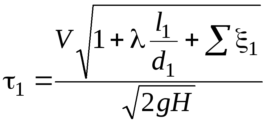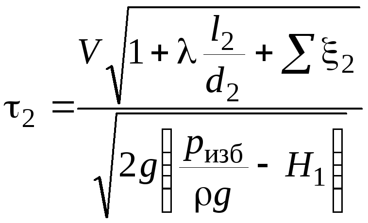 где H – напор, при котором жидкость поступает в монтежю, H1 – высота нагнетания жидкости, ризб – избыточное давление газа в монтежю, λ – коэффициент гидравлического трения, l1 и l2 – длины подводящего и отводящего трубопроводов жидкости, d1 и d2 – диаметры подводящего и отводящего трубопроводов жидкости, Σξ1 и Σξ2 – сумма коэффициентов местных сопротивлений всасывающего и нагнетательного трубопроводов.
