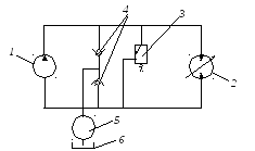 В гидроприводах вращательного движения, также как и в гидроприводах возвратно-поступательного движения, применяют объемное и дроссельное регулирование скорости вращения рабочего органа гидродвигателя. На рис. 5.10 представлена схема объемного регулирования, состоящая из нерегулируемого насоса 1, регулируемого реверсивного гидродвигателя 2, предохранительного клапана 3, обратных клапанов 4, насоса подпитки 5, бака 6.