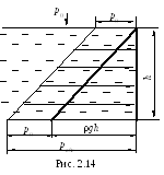 Графическое изображение изменения давления называется эпюрой давления. Построение эпюры необходимо выполнять с учетом свойств давления и закона его изменения. Так как основное уравнение гидростатики (2.6) является уравнением прямой линии, то для построения эпюры давления на плоскую поверхность необходимо определить величину давления в двух точках по ее высоте (например, вверху и внизу стенки), а затем отложить величину в виде отрезков определенного масштаба в тех местах, где оно найдено, расположив по внутренней нормали к поверхности, и соединить концы отрезков прямой линией. Изобразим на рис. 2.14 эпюру давления на вертикальную стенку. Эпюра гидростатического давления изобразится в виде треугольника, а эпюра абсолютного давления – в виде трапеции. Эпюры давлений на плоские наклонные стенки строятся аналогичным путем и имеют тот же принципиальный вид, что и на рис. 2.14.