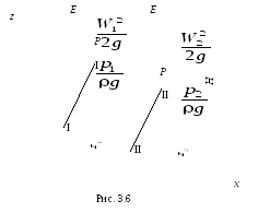 Линия Е–Е, проведенная по горизонтам жидкости в трубках Пито, называется напорной линией; линия Р–Р, проведенная по горизонтам жидкости в пьезометрах, называется пьезометрической линией (см. рис. 3.6). Для идеальной жидкости напорная линия всегда горизонтальна, а пьезометрическая линия либо горизонтальна, либо может иметь уклон как вверх по направлению движения жидкости, так и вниз (в зависимости от изменения площади живого сечения потока). Фигура, ограниченная пьезометрической линией и плоскостью сравнения, представляет собой эпюру изменения статического напора вдоль потока. В то же время фигура, заключенная между напорной и пьезометрической линиями, характеризует изменение скоростного напора вдоль потока. Итак, уравнение Бернулли выражает энергетический баланс движущейся идеальной жидкости.