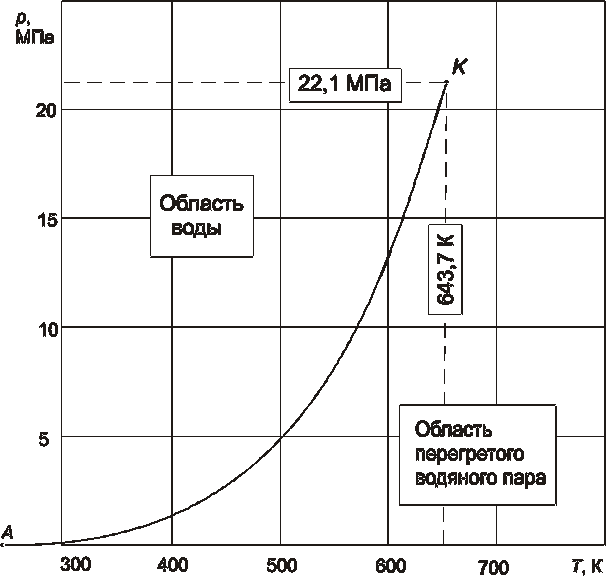 Точка K называется критической точкой. В сверхкритической области, при значениях параметров, больших рк или Тк (например, для воды при давлении рк 22,1 МПа и температуре Тк 647,3 К), скачкообразный переход из жидкого в парообразное состояние (или наоборот) не имеет места, так как за пределами точки K рабочее тело однородно и четко выраженных состояний пара и жидкости уже не существует.
