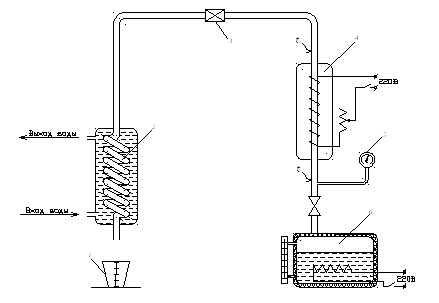 Благодаря подводу теплоты от нагревателя влажный пар превращается сначала в сухой, а затем в перегретый пар и через вентиль 3 поступает в конденсатор 2. Конденсатор сделан в виде трубчатого змеевика, расположенного в кожухе. Внутри змеевика движется пар, снаружи – охлаждающая вода. Вода отнимает теплоту от пара (температура воды ниже температуры пара), благодаря чему он конденсируется. Конденсат собирается в мерный сосуд 1.