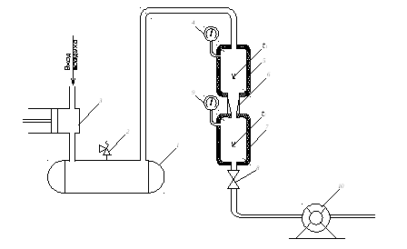 1 – ресивер; 2 – пружинный клапан; 3 – компрессор; 4, 9 – манометры; 5, 7 – камеры; 6 – суживающееся сопло; 8 – вентиль; 10 – счетчик (расходомер)