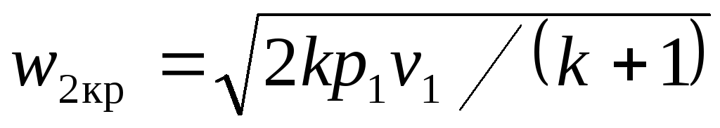 Анализируя формулу (1) для w2, можно было бы предположить, что при изменении от 1 до 0 происходит непрерывное увеличение скорости газа. Однако опытным путем установлено, что в этом случае скорость газа растет лишь до некоторого значения, называемого критической скоростью и обозначаемого w2кр. Критическая скорость истечения равняется местной скорости звука в выходном сечении сопла. Давление р2 на выходе из сопла, при котором расход газа достигает максимума, а скорость – значения w2кр, называется критическим. Соответственно отношение давлений р2кр /р1 обозначают через кр. Можно показать, что