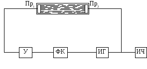 Звуковые и ультразвуковые методы и средства измерения основаны на изменении скорости распространения звуковых волн или степени затухания их интенсивности в зависимости от состава и концентрации анализируемой среды. На рис. 8.1 показана упрощенная структурная схема акустического (ультразвукового) анализатора жидкости. Его принцип действия основан на измерении частоты прохождения импульсов, возникающих в синхронизированном кольце, состоящем из измерительной ячейки с излучателем Пр2 и при-емником Пр1, генератора ИГ, формирующего каскада ФК и усили-теля У.