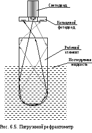 В погружных рефрактометрах (рис. 6.5) в качестве рабочего элемента используется сапфировый стержень, у которого один торец плоский, а другой – сферический. Если такой элемент находится в воздухе, то все направленные на него световые лучи испытывают полное внутреннее отражение и попадают на кольцевой фотодиод. При погружении в жидкость полное внутреннее отражение испы-тывают только те лучи, которые падают на поверхность раздела жидкости и рабочего элемента под углом больше критического.
