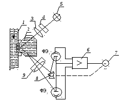 4 – предварительный светофильтр; 5 – источник; 6 – электронный усилитель; 7 – реверсивный двигатель, 8 – зеркало; 9 – оптический рассеиватель;