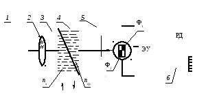 1 – источник; 2 – линза; 3 – диафрагма; 4 – кювета измерительная; 5 – компенсационная пластина; 6 – самописец; РД – реверсивный двигатель; ЭУ – электронный усилитель; Ф1, Ф2 – фотоэлементы