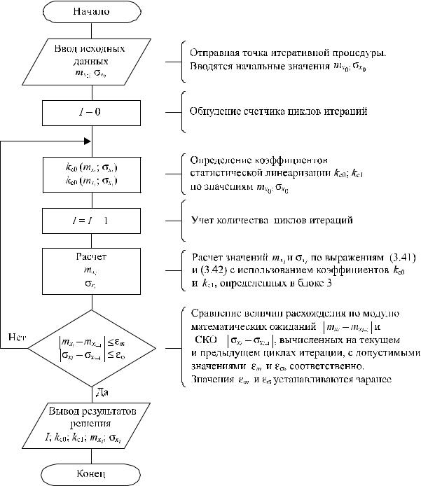 Уравнения (3.41) и (3.42) в общем случае содержат две искомые переменные (mx, х) и являются нелинейными. Поэтому они должны решаться совместно. Система уравнений такого типа решается либо графически, либо методом последовательных приближений. Блок-схема алгоритма нахождения решения таких уравнений методом последовательных приближений с краткими комментариями приведена на рис. 3.5.