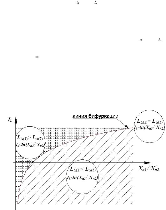 4. На основании результатов теоремы 4 (8.35)–(8.37) можно утверждать, что при использовании величины КЭП для оценки состояния неопределенности условие L (1) = L (2) и соответствующее ему выражение IL = ln(Xn1/Xn2) определяют «линию бифуркации» информационного поля системы. Сказанное проиллюстрировано на рис. 8.4. Здесь в декартовой системе координат Xn1/Xn2 и IL линия IL = ln(Xn1/Xn2) разделяет все пространство возможных значений величины IL системы на две области. В одной области, соответствующей условию L (1)