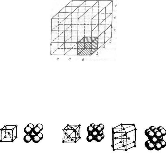 Общее свойство металлов и сплавов – их кристаллическое строение, характеризующееся определенным закономерным расположением атомов в пространстве. Для описания атомно-кристал- лической структуры используют понятие кристаллической решетки, являющейся воображаемой пространственной сеткой с ионами (атомами) в узлах.