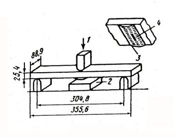 1 – падающий груз; 2 – опорная (ограничивающая) плита; 3 – участок сварного шва на нижней стороне образца; 4 – надрез