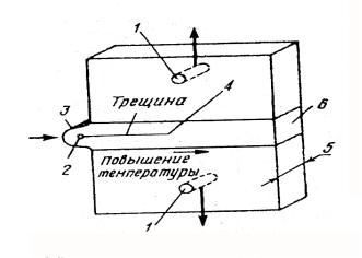 1 – нагружающие штифты; 2 – тонкий надрез; 3 – место нанесения удара; 4 – точка остановки трещины; 5 – толщина пластины;