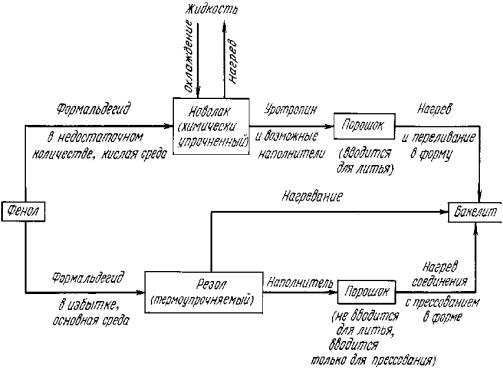 Фенопласты (бакелиты, фенолоформальдегидные смолы) изготавливаются в соответствии со схемой, приведенной на рис. 5.14.