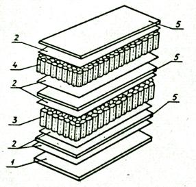 1 – алюминиевая стенка бака ракеты; 2 – клеевые слои; 3, 4 – сотовые заполнители; 5 – барьерные пленки