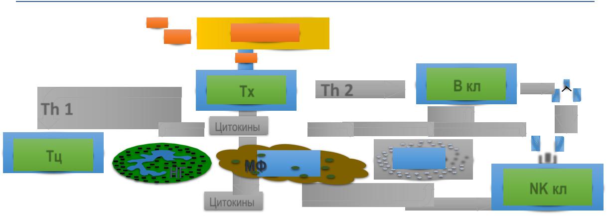 •Выбор эффекторного механизма (клеточный –Тh1, гуморальный-Th2)