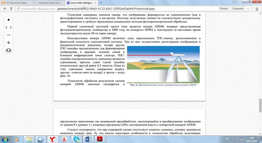Сканерная аэросъемочная система Геометрия сканерных снимков такова, что изображение формируется не одномоментно (как в фотографических системах), а построчно. Поэтому получаемые снимки не соответствуют центральному проектированию и требуют применения специальных методов фотограмметрической обработки. Первой съемочной системой такого типа является камера ADS40, впервые представленная фотограмметрическому сообществу в 2000 году на конгрессе ISPRS в Амстердаме (в настоящее время эксплуатируется около 50-ти таких камер).