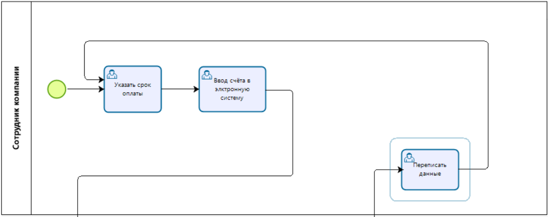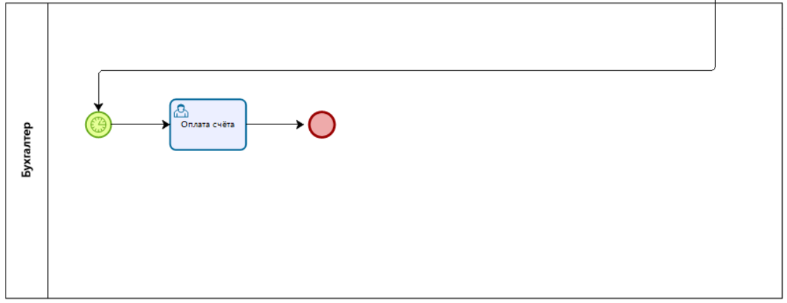 Стартовым событием процесса является получение счёта. Дальше сотрудник вносит счёт в электронную систему. Система автоматически определит руководителя сотрудника, запустившего процесс, исходя из организационной структуры компании, и отправит заявку ему на согласование счёта. Руководитель проверяет внесённые данные и согласовывает счёт. Согласованный руководителем счёт отправляется бухгалтеру. Бухгалтер оплачивает счёт. В завершении процесса бухгалтер отправляет квитанцию об оплате счёта владельцу.