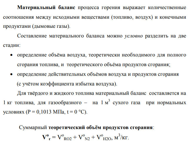 Тепловой баланс процесса горения составляется для определения температуры продуктов сгорания (газов). В адиабатных условиях все количество теплоты передается газам, образующимся при сгорании топлива. То есть теплота, выделяющаяся при сжигании топлива, расходуется на нагрев продуктов сгорания до определенной температуры: