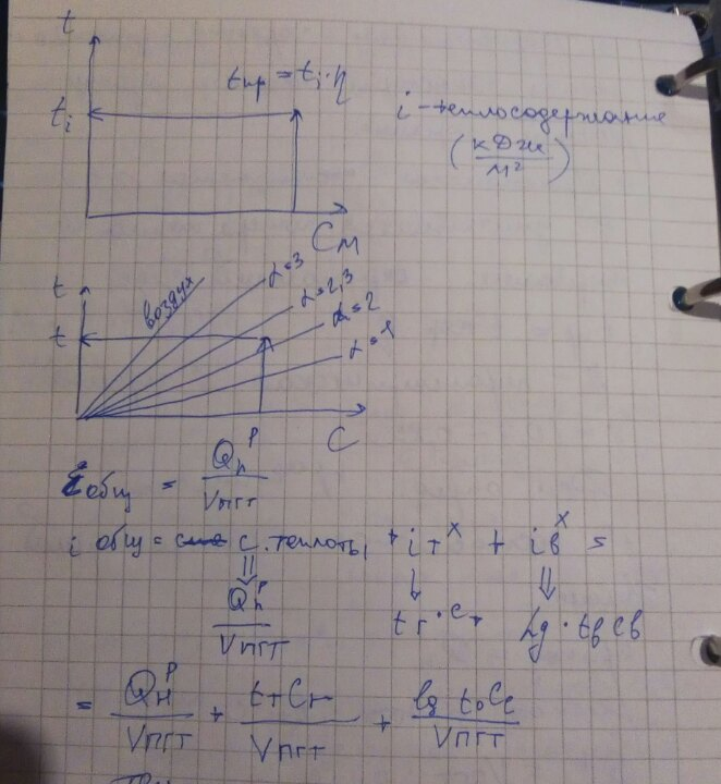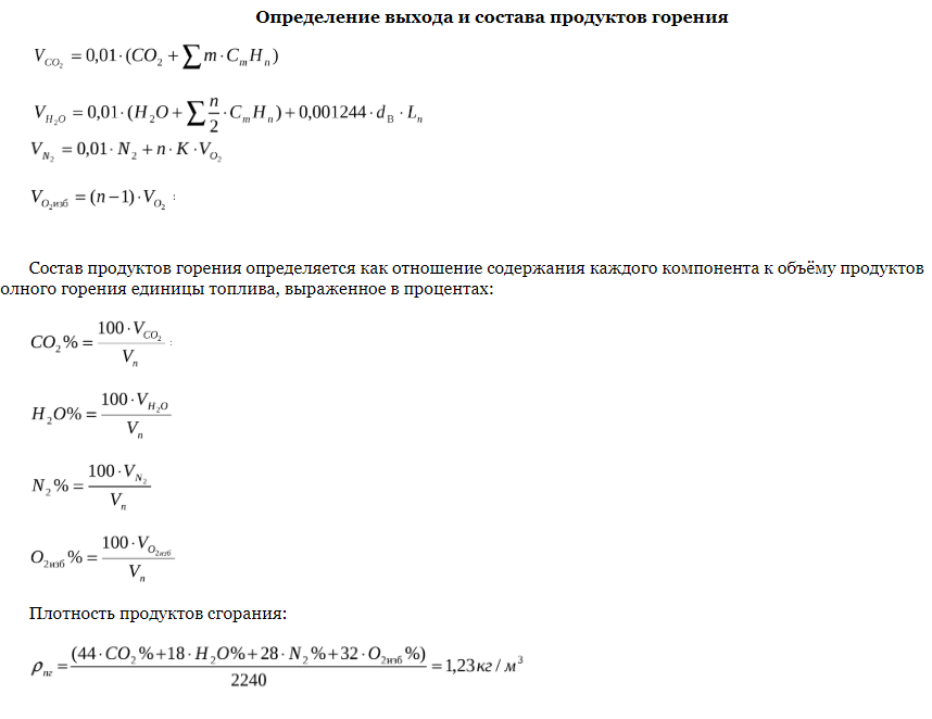 где QH - теплотворная способность топлива, Дж/м3; Vr - объем продуктов сгорания м3 пр. сг./м3 газа; ср - объемная теплоемкость продуктов сгорания Дж/(м3-°С); tr- температура продуктов сгорания, °С; t0- начальная температура продуктов сгорания, °С.