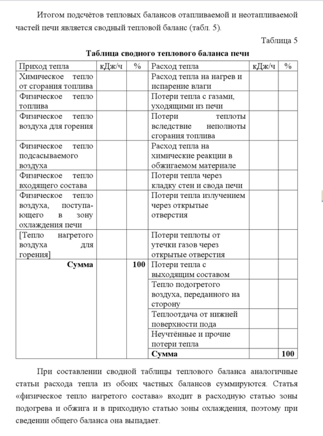 Тепловой баланс составляют либо для всей конструкции в целом, либо для определённых зон - отдельно зона подогрева и обжига, отдельная зона расхода