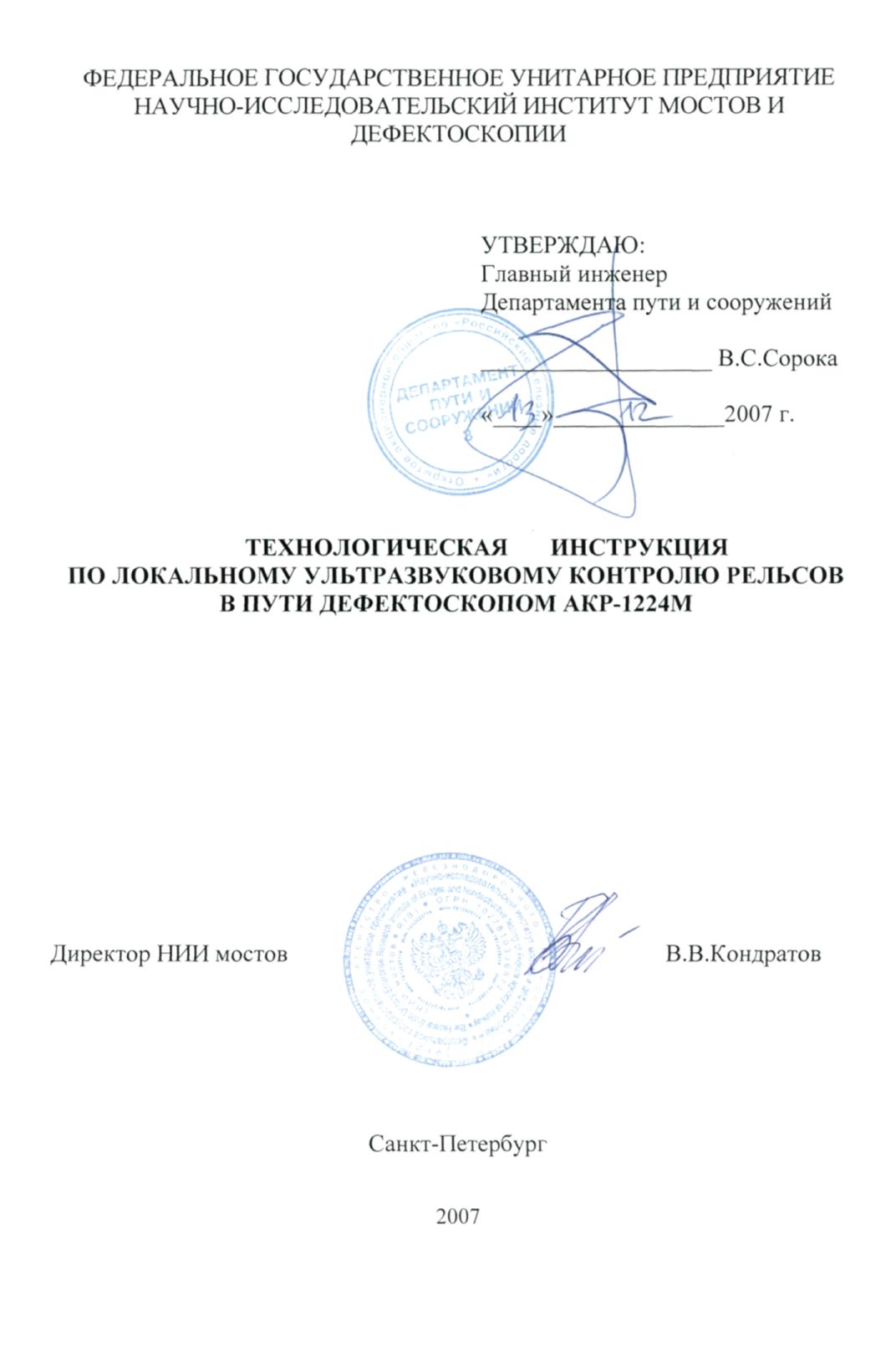 1.1 «Технологическая инструкция по локальному ультразвуковому контролю рельсов в пути дефектоскопом АКР-1224М» (далее – ТИ) распространяется на ультразвуковой контроль (далее – УЗК) отдельных сечений рельсов, подлежащих осмотру по результатам контроля мобильными и съемными средствами неразрушающего контроля мобильными и съемными средствами неразрушающего контроля (далее – НК).